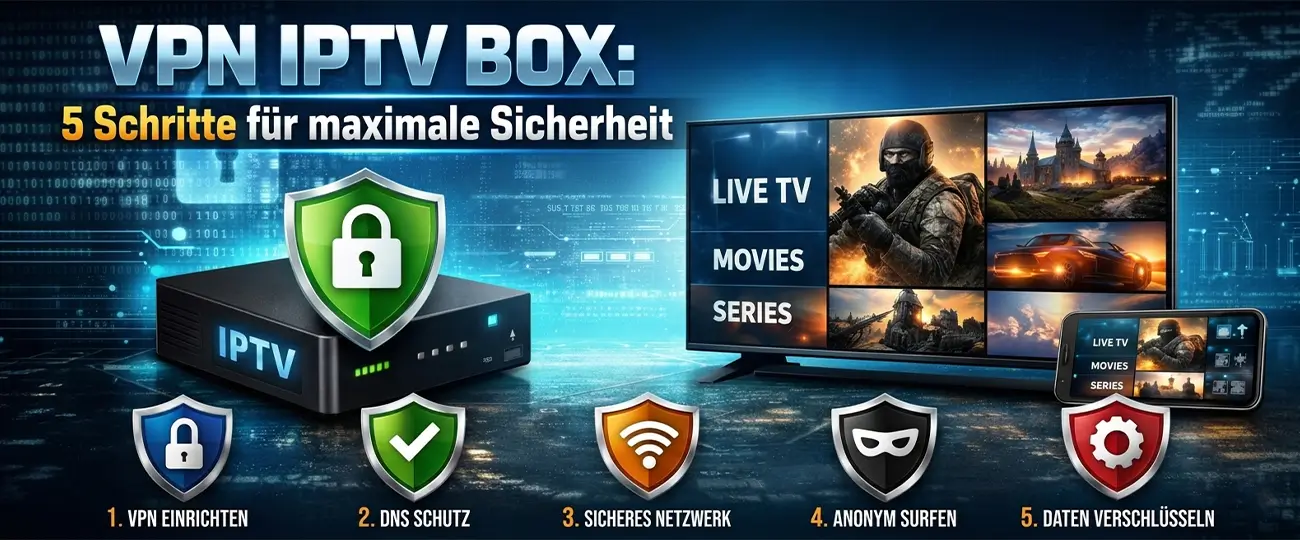Eine VPN IPTV Box ist ein Streaming-Gerät, auf dem ein VPN läuft. Es verschlüsselt deine Verbindung und versteckt deine IP, damit niemand mitlesen kann.